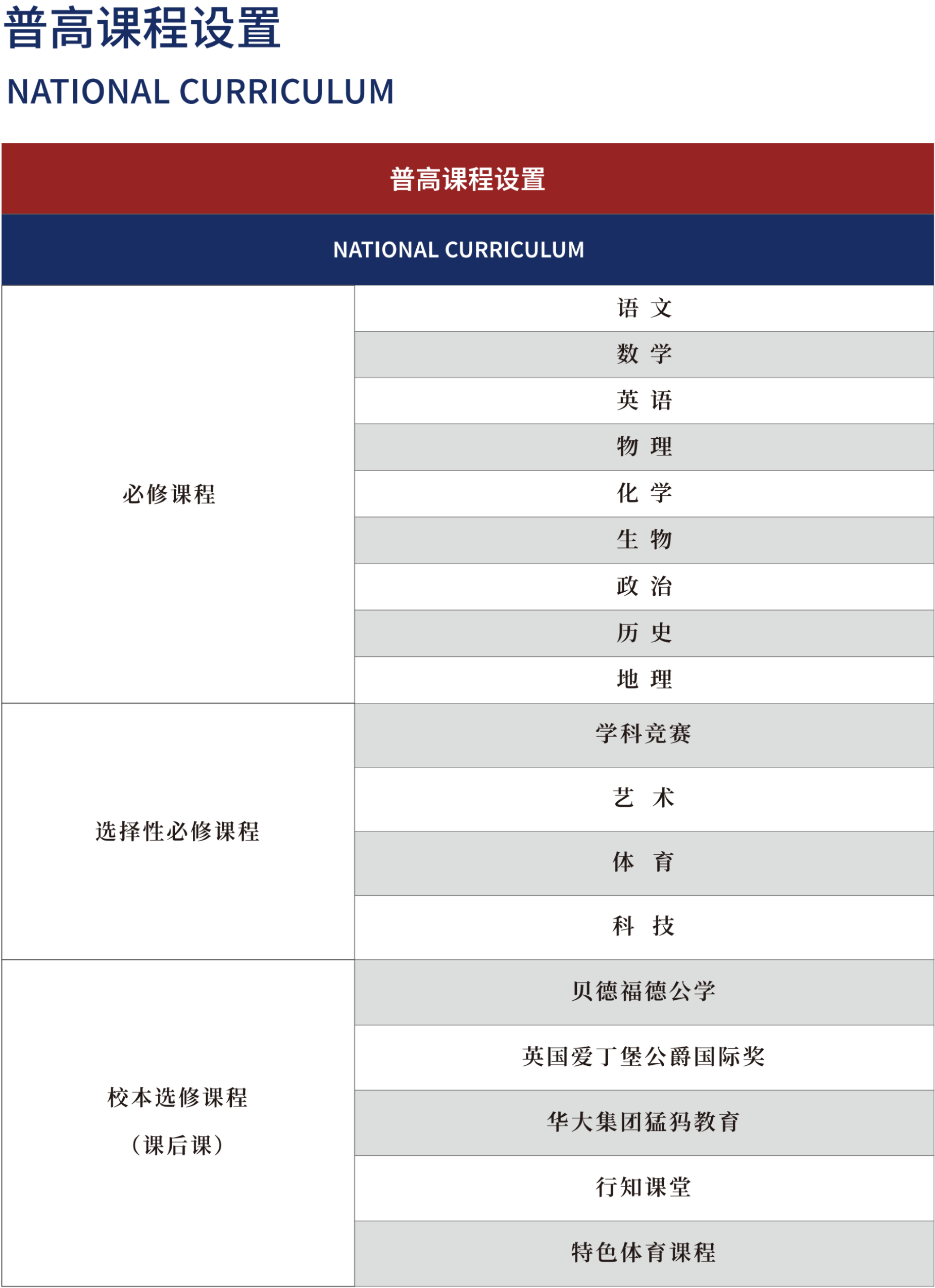 学校坚持以人为本,落实立德树人的根本任务,在课程设置和实施过程中突出学习者的主体地位,培养有理想、有本领、有担当的未来人才。学校普高(国内高中)部以国家课程为核心,融合中西方先进教育理念,按照国家创新教育要求,结合万科德英乐特色资源,形成涵盖国家课程、校本课程和拓展课程的特色课程体系,提供丰富的课程资源和以人为本的多元课程选择,支持每个学生的均衡发展,实现全人培养的目标,为学生终身发展奠基。(如图所示)