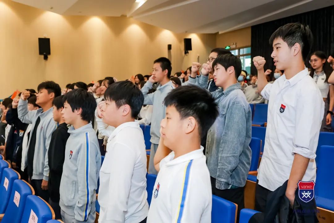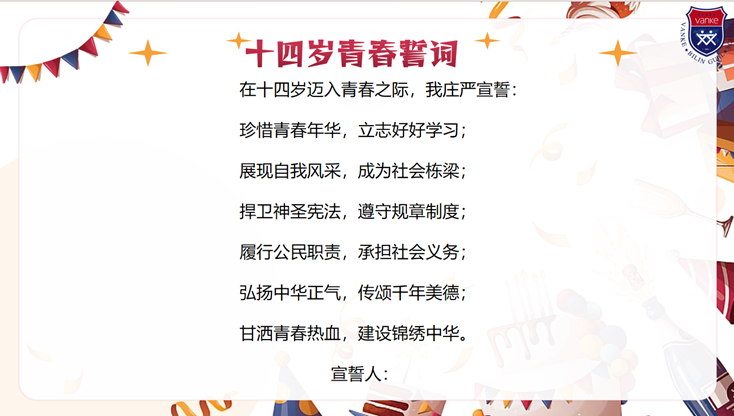 青春,为梦想,扬帆起航,乘风破浪。青春,昂起头,勇敢前行,担当责任。在Sara、Ian两位同学的带领下,八年级全体同学以青春的名义郑重宣誓: