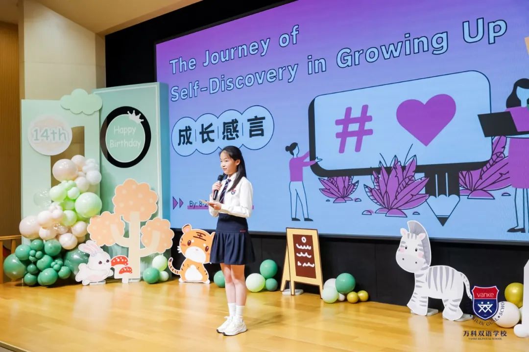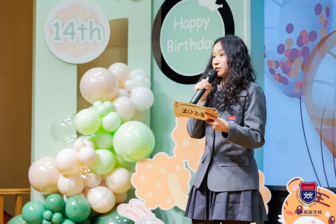 8-2班的Sara作为学生会主席发言,她和我们分享了数字14在中外文化中的不同理解,讲述了她对14岁的定义,是创新、热情、坚韧、冒险和好奇,更是责任,我们应当表现出同理心、善良和积极的态度,尊重和照顾周围的人和世界,承担更多的责任,成长为成熟、体贴、坚定的成年人!