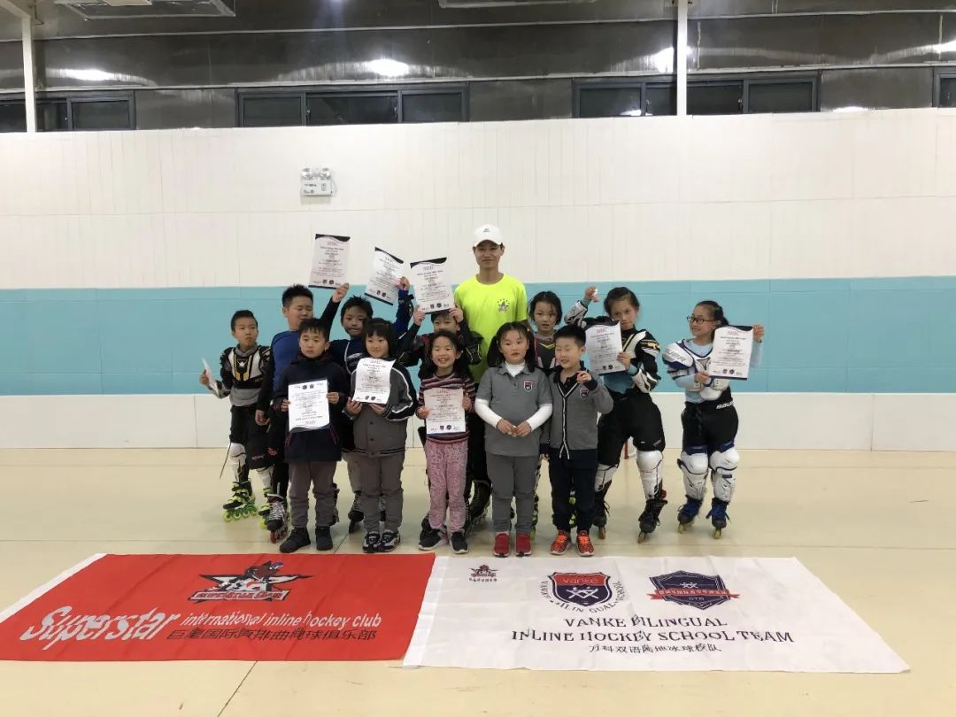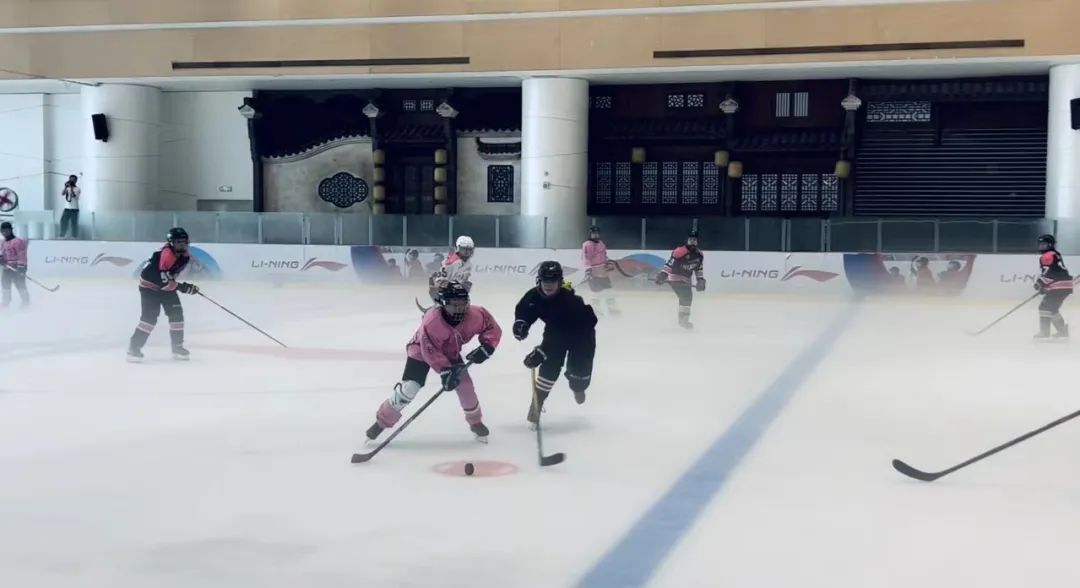 除了舞台,冰球场上也有毛豆活跃的身影。VKBS作为上海市轮滑冰球人才培养基地,为毛豆带来了冰球启蒙,现在她已是冰球女队的一员,经常参与各地比赛。但你能想象么,三年前,她在家练习时,连球杆也拿不稳,是持续8个月无一天间断的打卡练习让她找到了坚持下去的勇气。“暴风成长”的背后是无数次摔倒,无数次手脚磨破,无数次重复训练,谈起这段经历,毛豆轻描淡写地说到“当然痛啊,但我还是想跟着女队打比赛。” 冰球校队中的毛豆(最右)