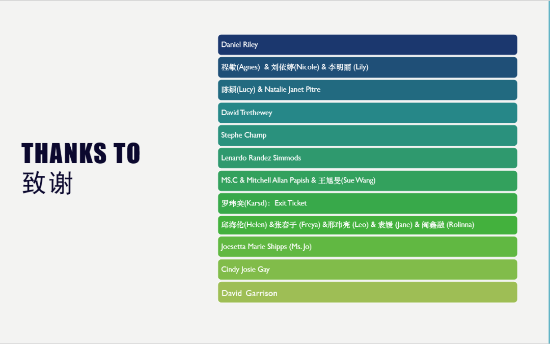学校的价值使命不在于外在的光鲜亮丽,而是聚焦在学生本身,关注学生自身成长的动态过程,通过每个阶段的详细评价,让他们在原有的基础上有比较好的发展与提高,激发并持续发展学生内在成长的潜能。愿每一个孩子在学校这棵参天大树下茁壮成长为一棵棵栋梁之树。最后特别感谢为此次培训做出贡献的老师们!