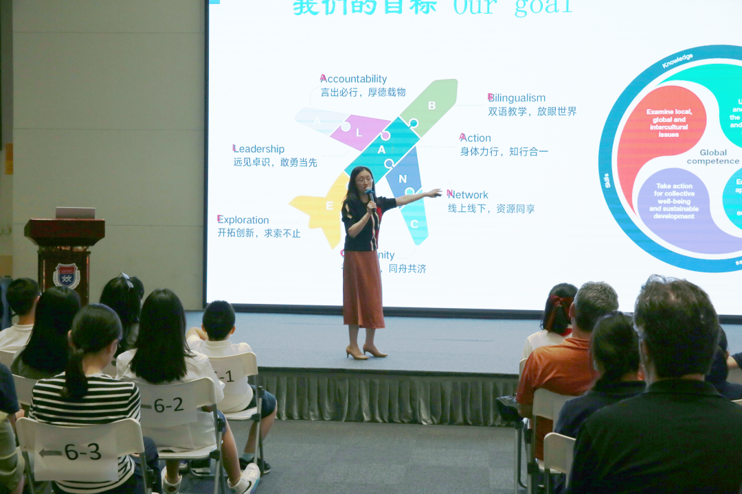 程校长从7个方面介绍了我校 “均衡发展、全人培养”的升级版教育观“BALANCE”,包含跨文化的双语教学Bilingualism、丰富的校园主题活动Action、注重培养学生领导力素质Leadership、全面的学生素质测评报告Accountability、提供学生线上线下的优质资源Network、社群共建、家校共育Community和项目研究式学习Exploration。