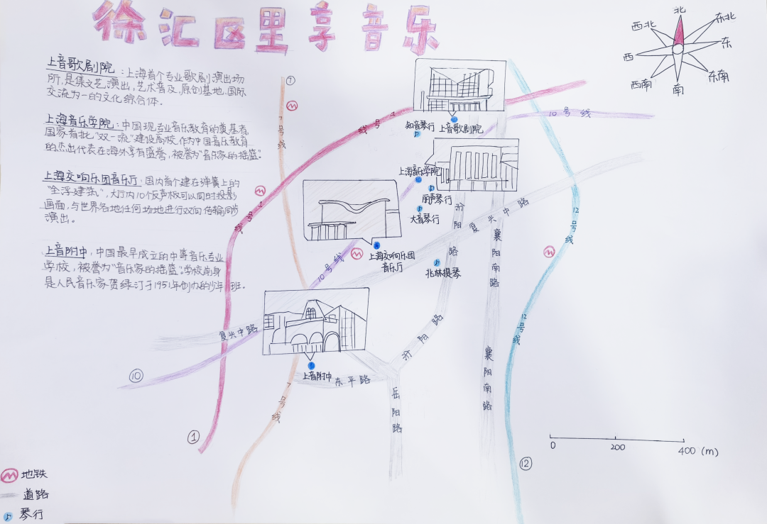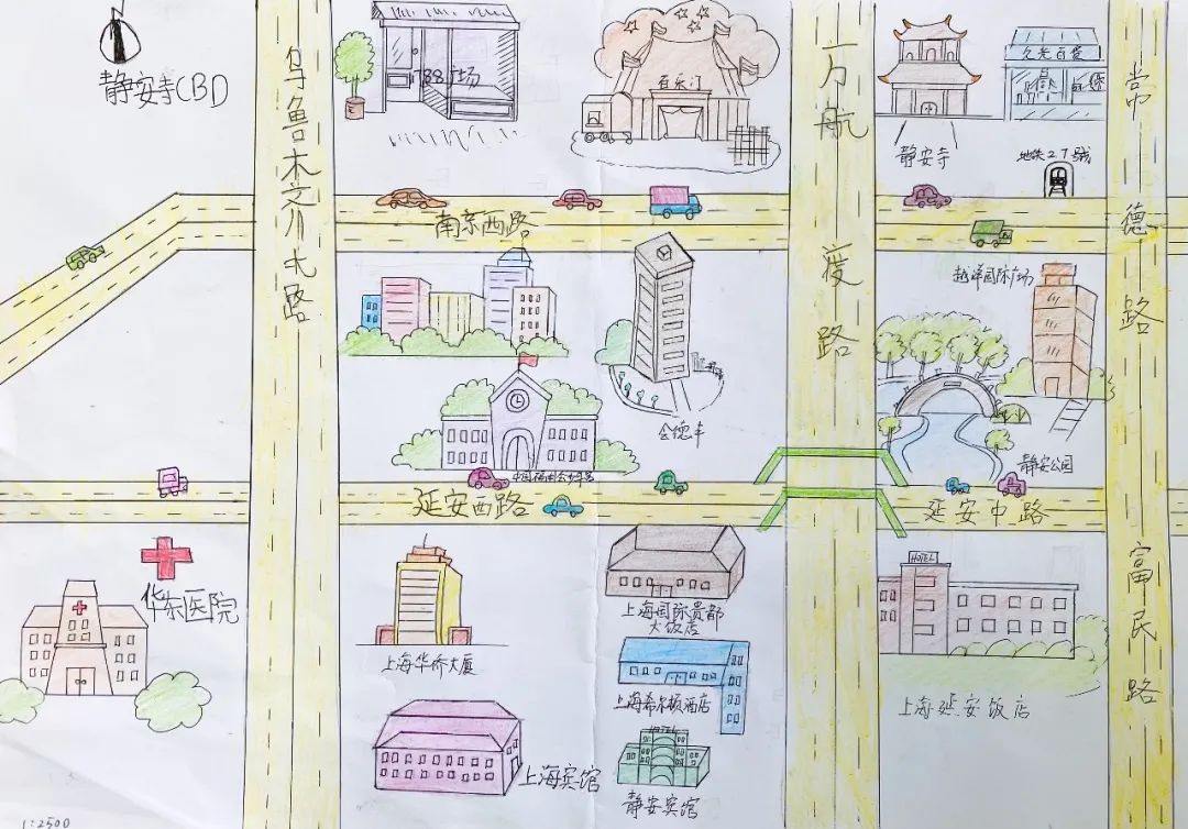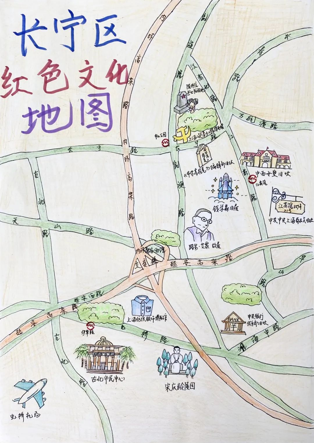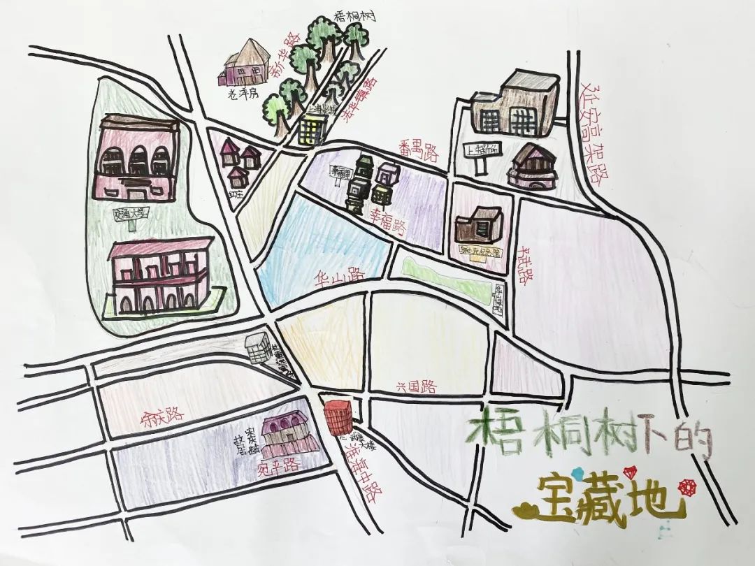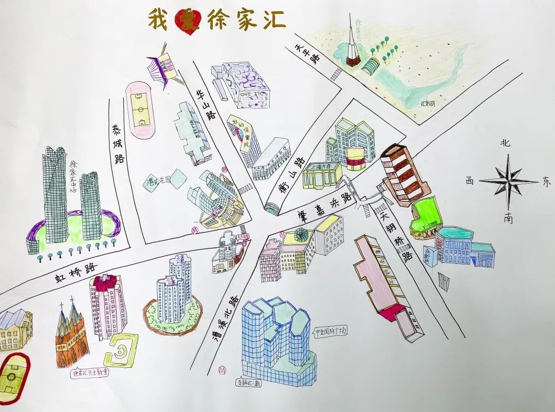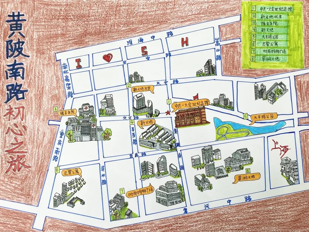 ▲有的同学以红色为背景,向大家展示出了黄陂南路的初心之旅,形象地绘制出了街道两旁重要的建筑,如中共一大会址纪念馆,太平桥公园等,地图工整美观,图例清晰;