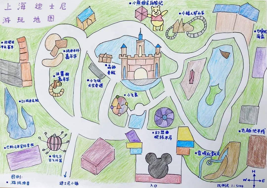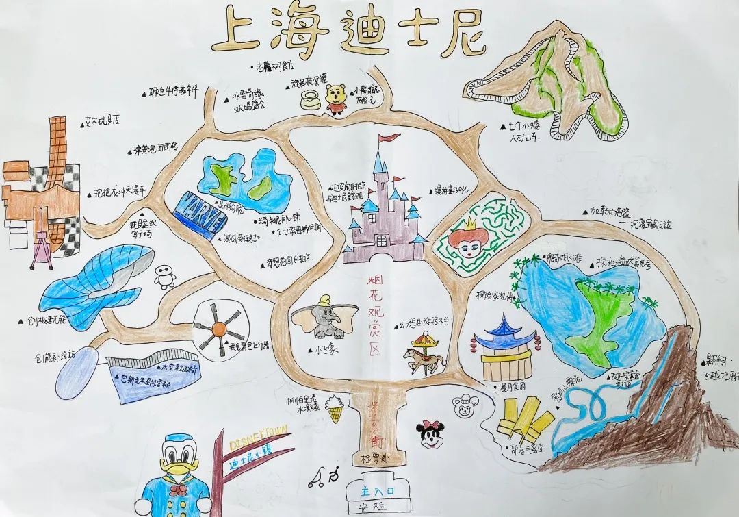 孩子们利用休息日漫步上海,实地考察了解这座城市的细微局部,发现上海的独特魅力,在设计过程中除了运用地理课上学的地图、指向标、比例尺和图例等知识点,同时查询电子地图、地图杂志、游乐园、博物馆路线图,并把自己的创新设想融进手绘地图中。