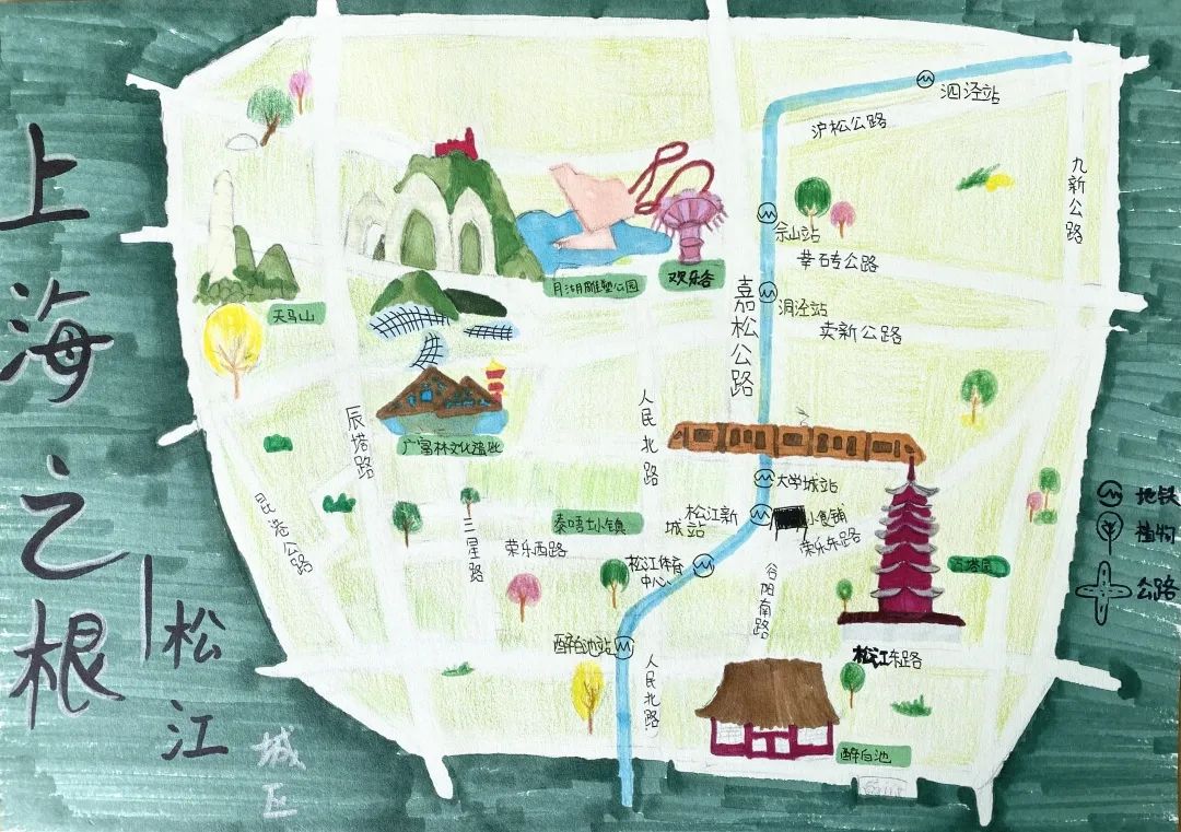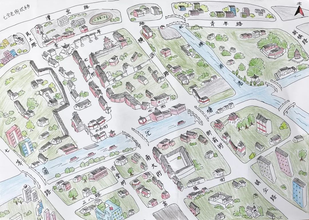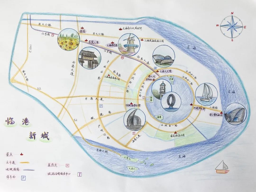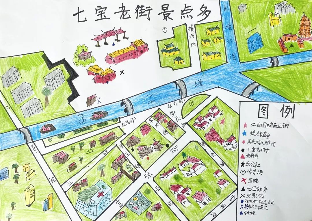 ▲有的同学的地图展示了上海的众多网红打卡点,如临港新城附近的景观和建筑,和谐的色彩搭配让人眼前一亮,各大建筑和景观十分有立体感,无一不体现了精良的画工;有展示学校附近的七宝老街特色街道,充分还原了七宝老街的建筑和生态环境,配以地图要素中重要的指向标和注释,更加精确的展示了老街美景;