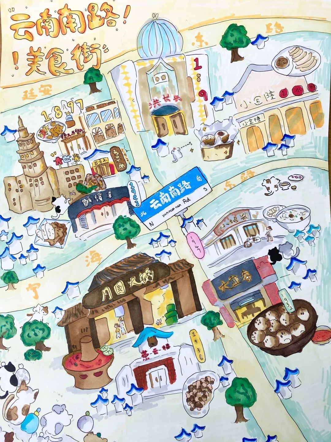 ▲有的同学则别具匠心,利用整篇A3纸,绘制了云南南路的美食街,不仅生动的画出了各个特色建筑和美食,还加入了娇小玲珑的小动物们……