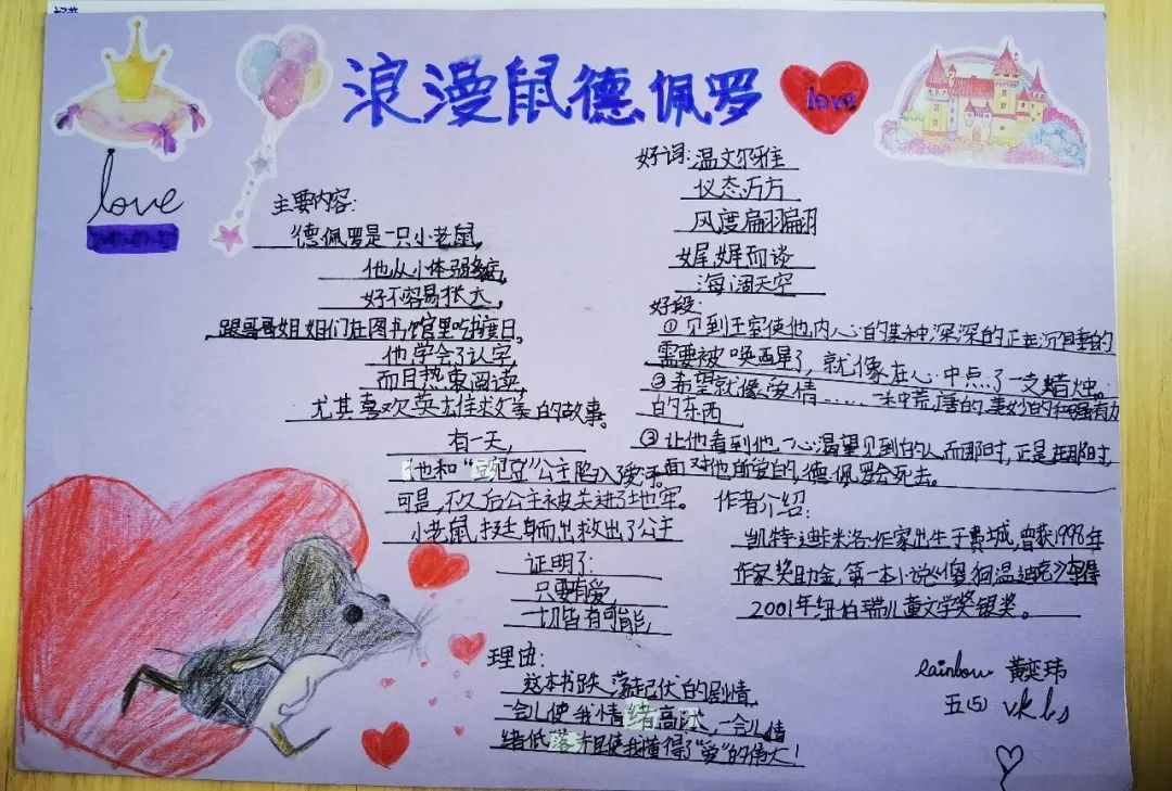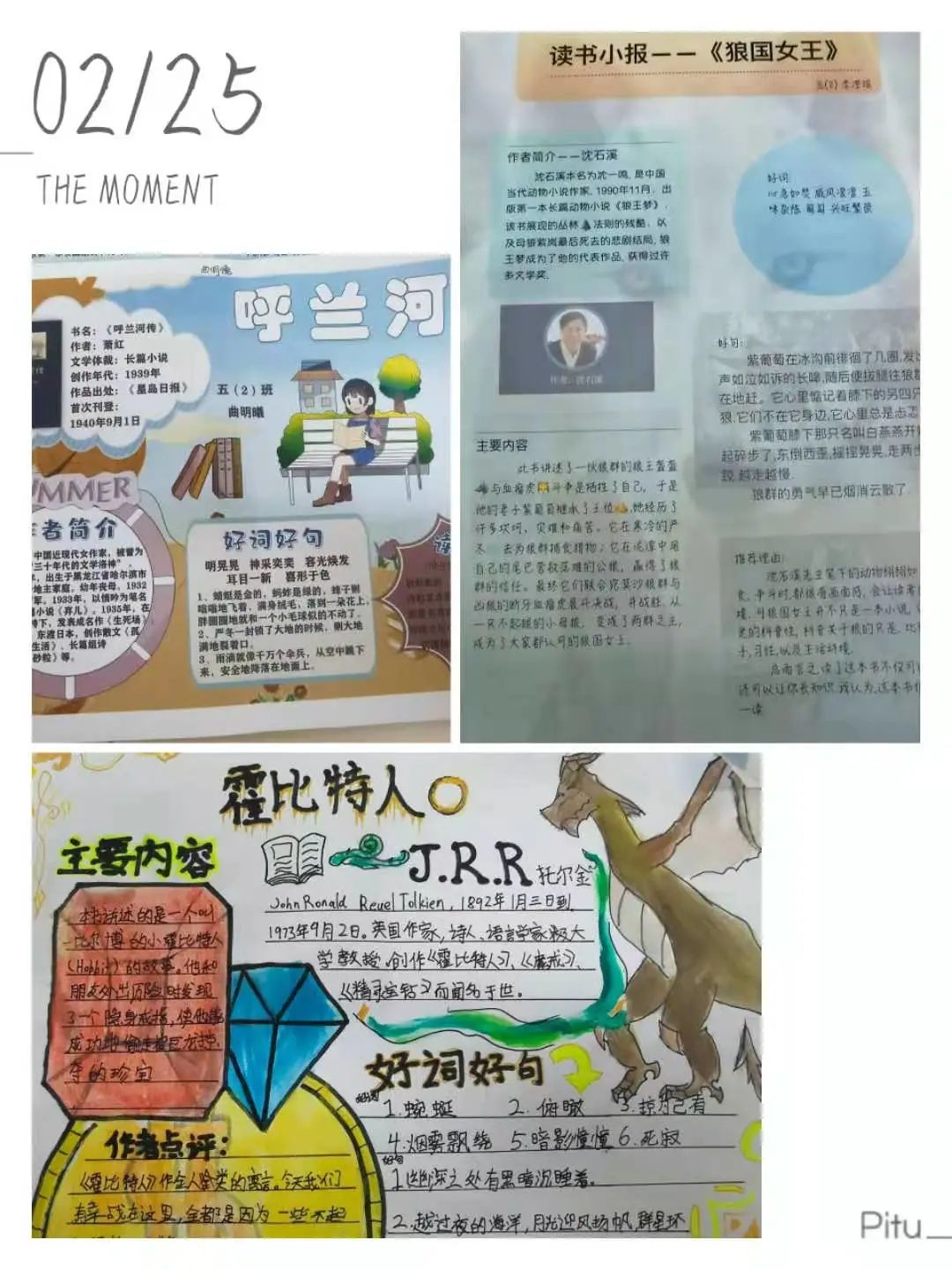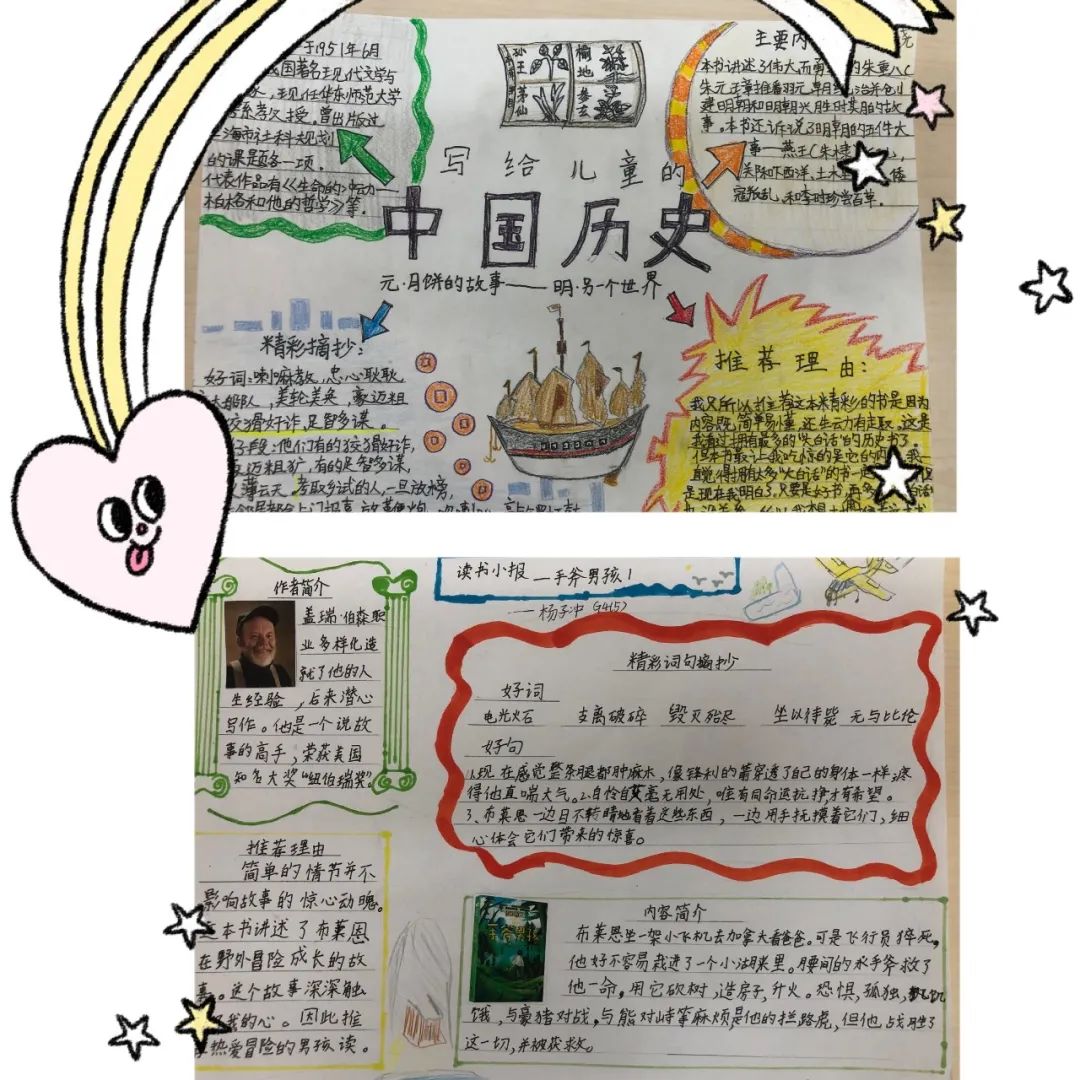 “书籍是人类进步的阶梯”,学生养成独立阅读的习惯,会在智力发展、道德发展和审美发展中起着至关重要的作用,还会提升他们的整体综合素质,使小学生身心得以健康成长、潜能得以充分的发挥,以适应和面对未来社会的挑战。一份份精美读书小报映入眼帘—“写给儿童的中国历史”、“呼兰河”、“霍比特人”、“西游记”……让人眼前一亮。