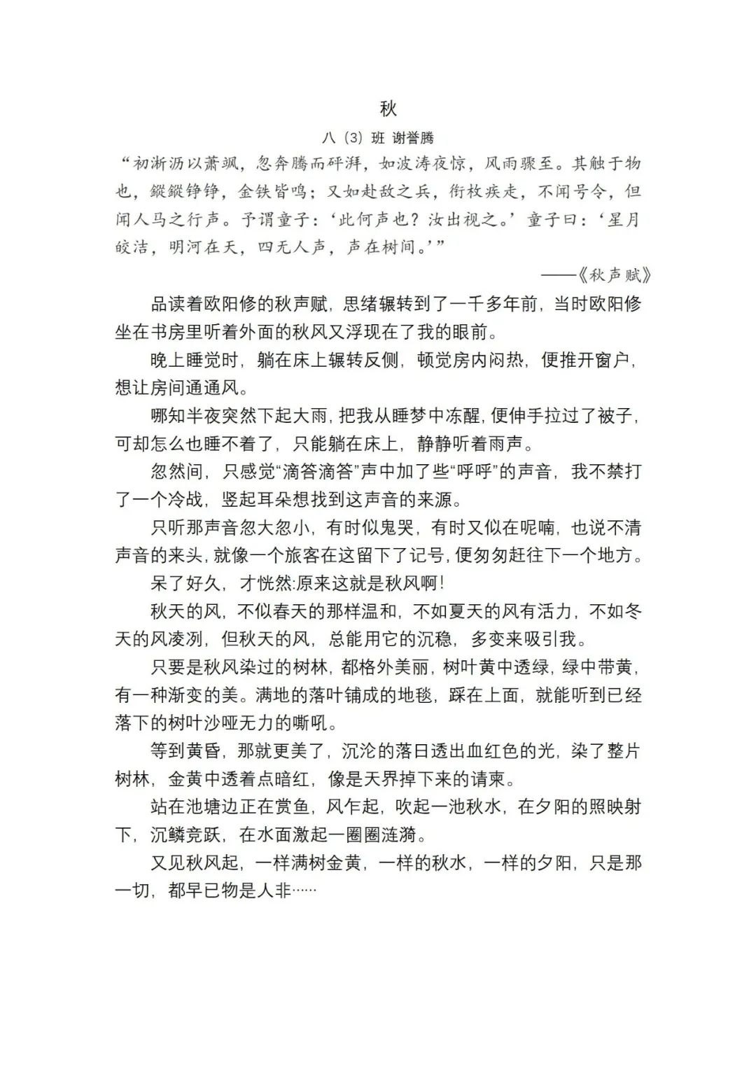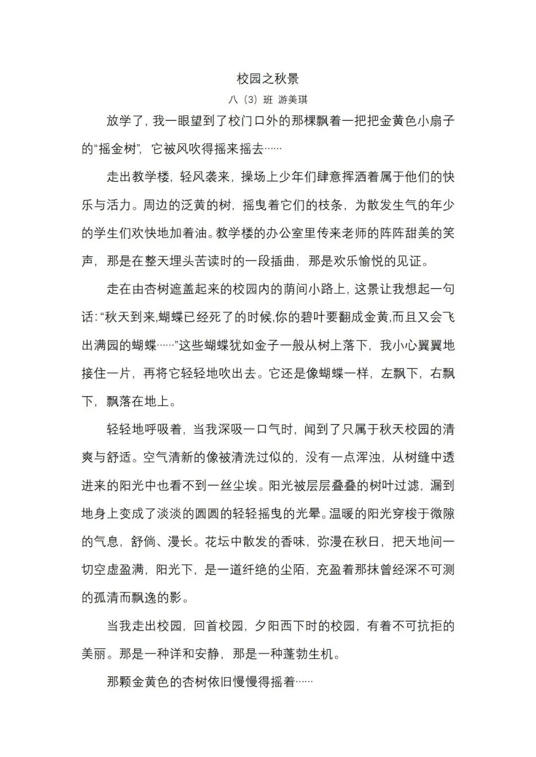 秋天的美是诗意的。美丽的词藻让人神往,孩子们的文字转换为一幅幅美丽的图画在读者的脑海中浮现,那么轻柔,那么美!