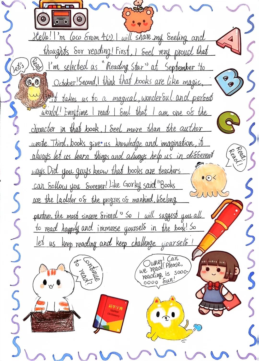 In a collaborative effort uniting both Chinese and international teachers, alongside the dedicated involvement of students and parents, VKBS has witnessed the creation of numerous outstanding bilingual works. As we review the highlights of ‘The Hundred Book Odyssey‘ from the past two months, let’s appreciate the insightful reading notes and reflections shared by the initial ‘Reading Stars’ in this year’s challenge within our literature-filled campus.