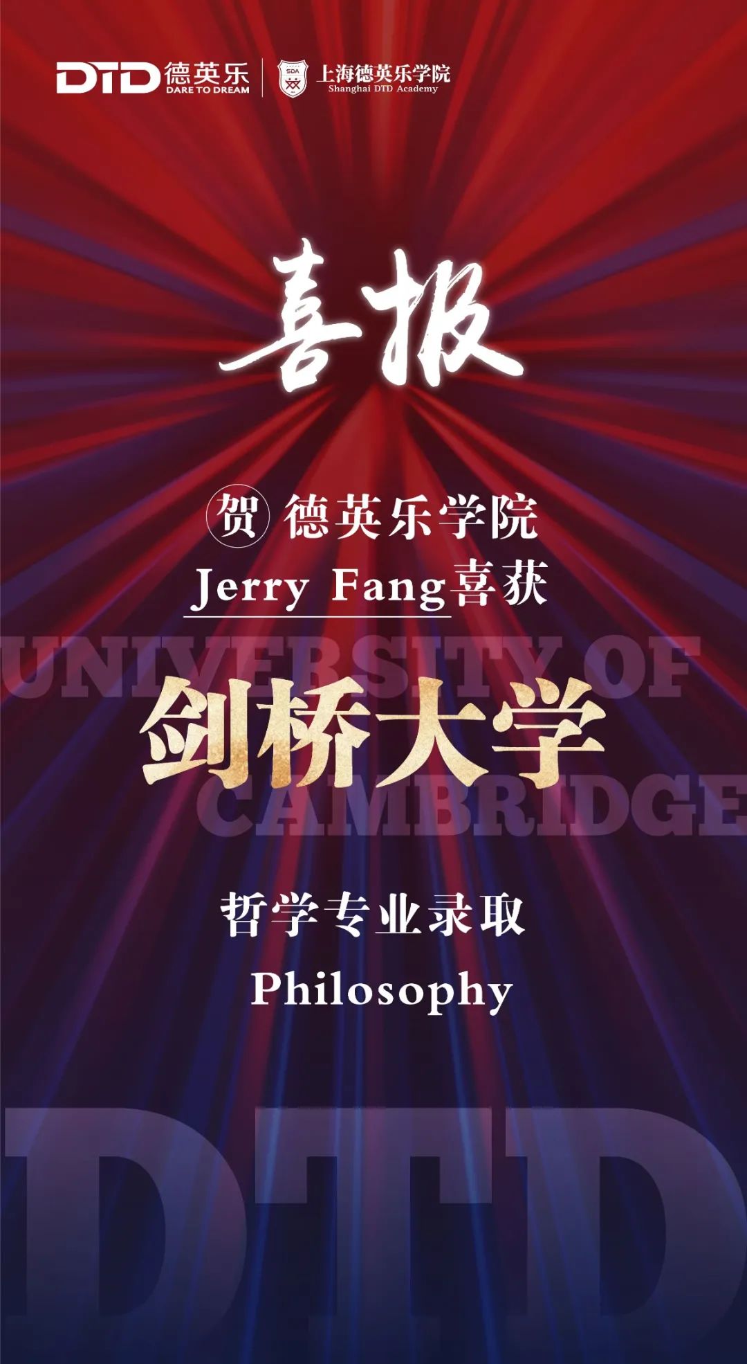 1月25日晚上9点45分,上海德英乐学院迎来了史上第一枚剑桥大学录取!恭喜方榕剑Jerry 同学荣获 剑桥大学哲学专业录取!