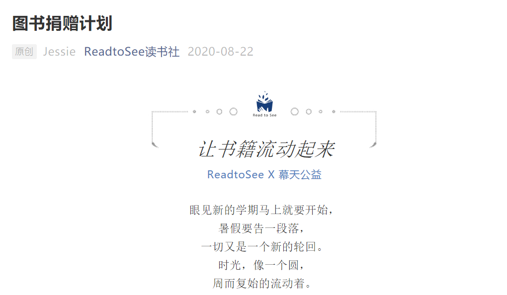 在Jerry和他的社员心中,始终把推广阅读当作使命。于是他们开始策划一场图书捐赠活动——让书籍流动起来,把知识和爱心传给需要的人。他们找了公益基金,进行一系列的考证,并向广大师生们征集书籍,追溯书籍的去向,书籍最终送到了需要它们的学校手中……带动身边的资源并运转起来,是这一群高中生开始尝试的事情。